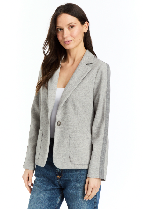 This is a combination of the structure of a blazer with the ease of an everyday jacket. Tailored in a versatile gray hue, it features clean lines, a polished lapel, and a streamlined silhouette that layers effortlessly over any look. Perfect for workdays or weekends, this piece strikes the balance between sharp tailoring and modern outerwear.