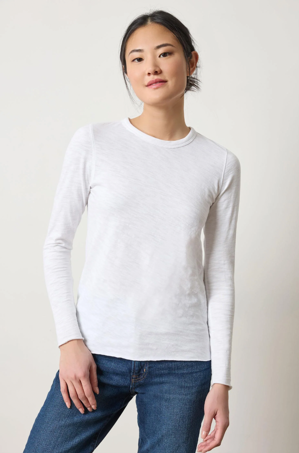The Long Sleeve Bias Cut Crewneck in our mid-weight cotton slub is a fresh take on a classic crewneck. The body and rib trim at the neckline are cut on the bias, creating a flattering fit that gently hugs the body. Merrow edges at the hem and sleeve openings add a subtle, undone touch for a look that feels effortless and modern.