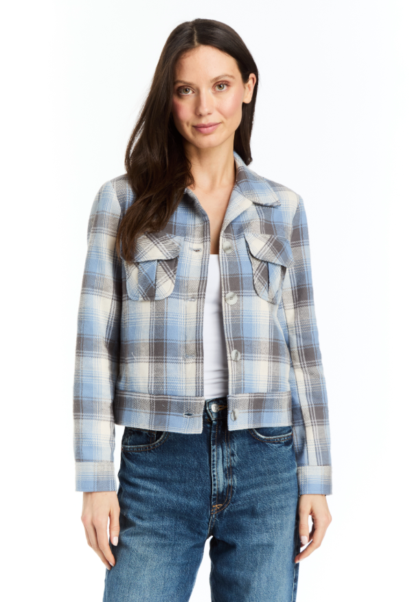 The Maribel Jacket is a versatile layer that blends polish with everyday ease. In classic Coffee, it offers a sleek solid finish for timeless styling, while the Sky plaid brings a fresh, modern twist with its soft check pattern. Designed with a relaxed fit and tailored detailing, this jacket is perfect for layering over everything from blouses to knits, making it a wardrobe staple you’ll wear on repeat.