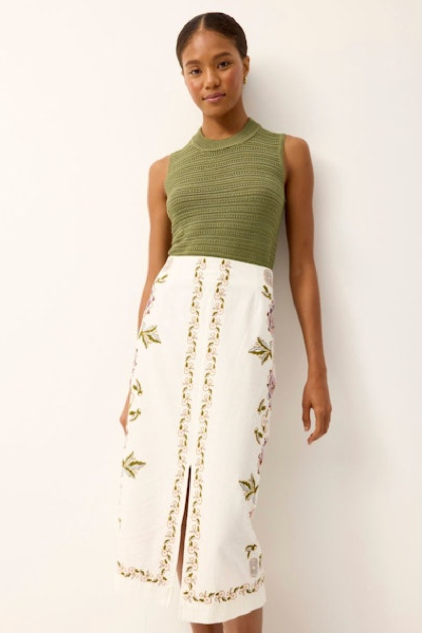 Effortlessly cool, endlessly versatile. The Nev Top in Pesto is a sleeveless open-knit sweater vest with a relaxed crewneck and subtle mixed-stitch texture that gives it just the right amount of laid-back polish. The rich olive hue pairs beautifully with everything from tailored shorts to wide-leg trousers.