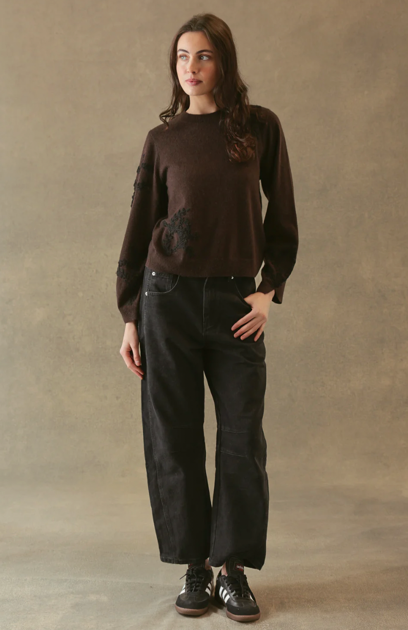 The Pelta Sweater is a refined cashmere crewneck featuring delicate tone-on-tone floral embroidery, offering an elevated, feminine look with cozy feel.