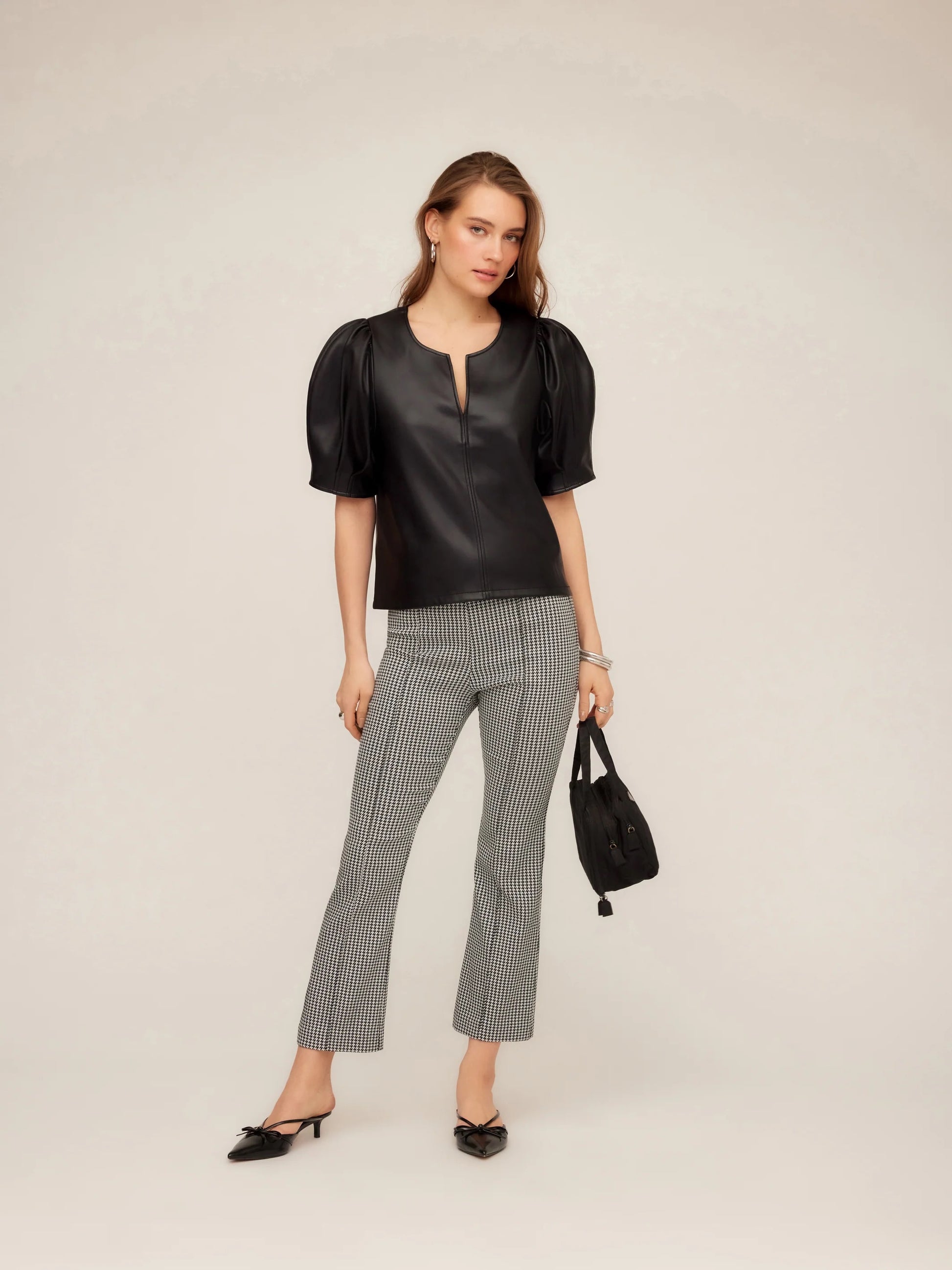 Crafted from smooth faux leather, this pull-on top features a clean split neckline and voluminous short puff sleeves that create a modern, structured silhouette. Soft gathers at the sleeve caps combine with subtle back pleating to enhance the sculpted shape. A sleek center-front seam with double topstitching adds understated texture. Perfect for elevating everyday denim or pairing with tailored separates for a polished look.