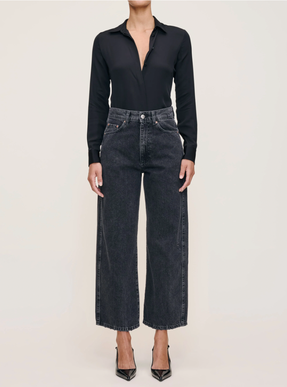 Nightshade is a washed black denim. It features a silver shank, matte copper rivets, tonal stitching, clean hem, and a black back patch.