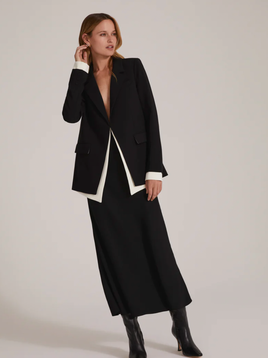 Crisp white shirt tail and cuffs add a layer (literally) of sophistication to the Kelly Blazer. Made from smooth fabric with a hint of stretch, this open-front blazer has front flap pockets and a hidden hook-and-eye closure for an elevated menswear look.