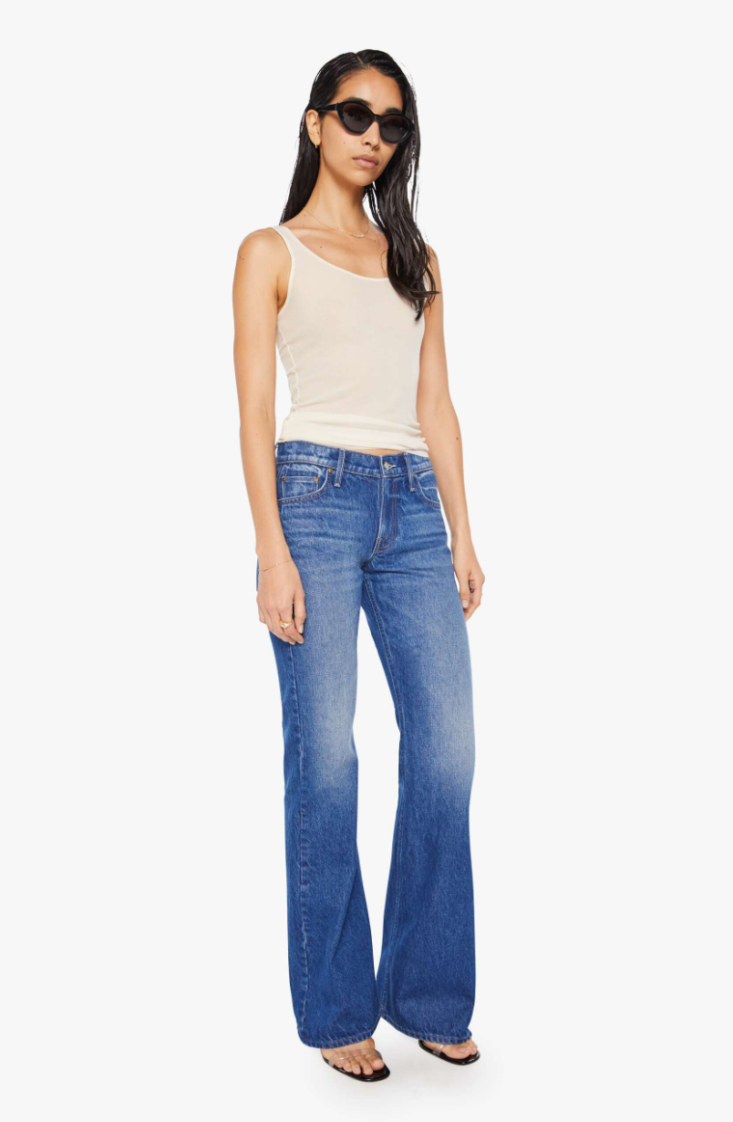 A bootcut jean from SNACKS!, a collection of unconstrained silhouettes leaning into exaggerated shapes and extreme proportions. Experimental and non-era specific. For everyone, or not. The low-rise jeans feature a slightly flared leg and a long 34-inch inseam with a clean hem. Made from a rigid recycled cotton blend, Scrumptious is a mid-blue with fading, whiskering, a pretzel-detailed button and candy-inspired interior rivets. Would you like a treat?