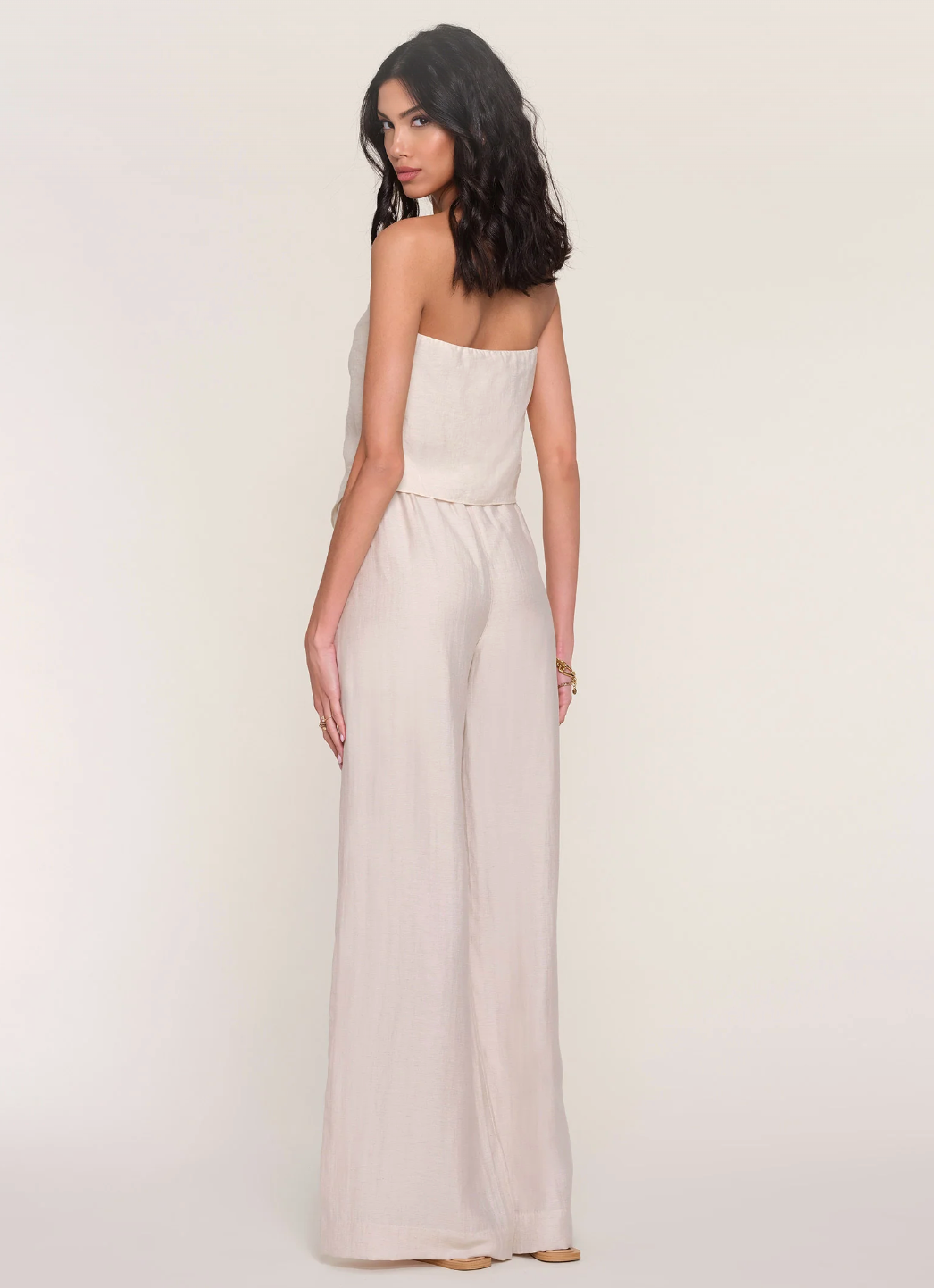 An effortlessly breezy outfit, the Violet Set is made from a linen blend. It features a strapless top with sunburst pintucks and an elastic waist trouser.